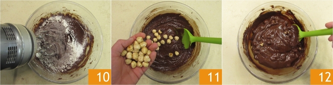 Incorpore os ingredientes secos com a batedeira até obter uma massa lisa e homogênea 10. Nesse ponto, adicione as avelãs torradas 11 e incorpore-as com uma espátula de silicone 12.