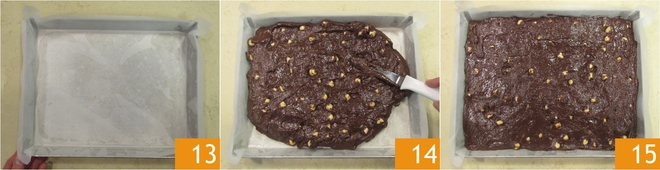 Forre uma forma de 21x28 cm com papel manteiga 13, despeje a massa dentro e nivele de forma uniforme 14. Asse em forno estático a 180° por 25 minutos 15.