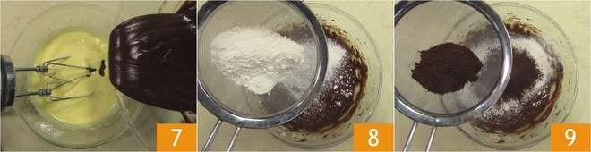 Quando obtiver uma mistura clara e espumosa, adicione a mistura de chocolate e manteiga resfriada 7 e mexa por alguns minutos com a batedeira. Finalmente, peneire a farinha 8 e o cacau na tigela 9.