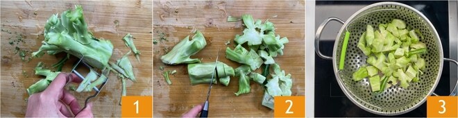 Para preparar as bruschettas com creme de brócolis, primeiro descasque o talo do brócolis com um descascador para remover a parte externa mais dura 1, depois corte-o grosseiramente 2. Corte as folhas em pedaços também, se houver. Cozinhe os talos e as folhas no vapor por 10 minutos 3.