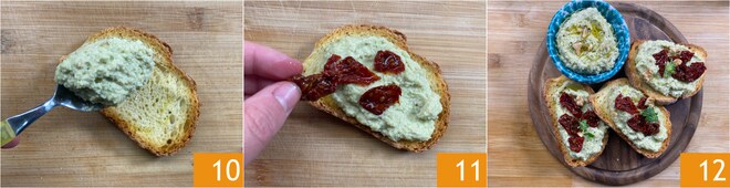 Espalhe o creme de brócolis sobre as fatias de pão torrado 10 e decore a gosto com tomates secos 11 ou anchovas. Suas bruschettas com creme de brócolis estão prontas para serem saboreadas 12!