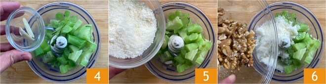 Transfira tudo para um processador e adicione o dente de alho sem o miolo 4, o Pecorino ralado 5 e as nozes 6.