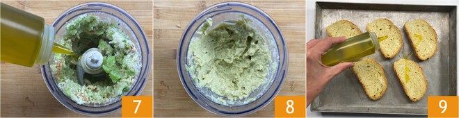 Bata por alguns segundos, depois adicione o óleo aos poucos 7 e continue batendo até atingir uma consistência cremosa e homogênea 8. Ajuste o sal e a pimenta da crema de brócolis. Neste ponto, corte o pão em fatias, regue com óleo 9 e pimenta e toste no forno quente por alguns minutos.