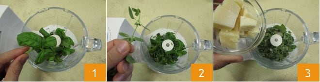 Para preparar as bruschettas com pesto de ervas e sardinhas grelhadas, comece preparando o pesto rápido. No mixer, coloque as folhas de manjericão 1, algumas folhas de melissa e algumas de orégano 2, depois sal, pimenta e o parmesão em pedaços grandes 3