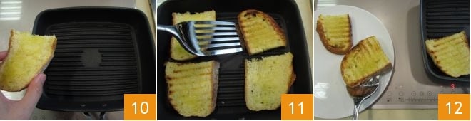 e cozinhe em uma grelha bem aquecida 10. Levará cerca de um par de minutos, depois você pode virar as fatias e cozinhar do outro lado 11. Uma vez prontas, coloque as fatias de pão em um prato e mantenha a grelha aquecida 12.