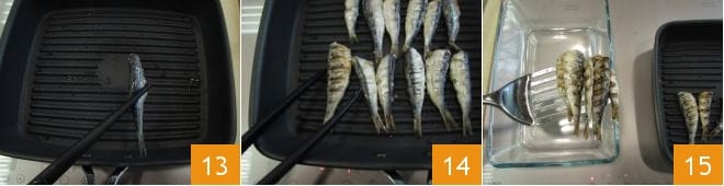 Retome as sardinhas temperadas e coloque-as na grelha ainda quente 13. Cozinhe-as também por um par de minutos de cada lado, virando-as quando a pele começar a se soltar da grelha 14. Uma vez cozidas, transfira-as também para um recipiente 15.