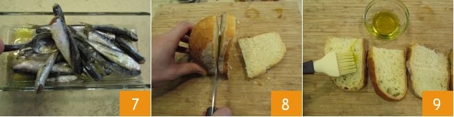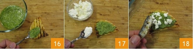 Neste ponto, tudo está pronto para prosseguir com a composição das bruschettas: sobre as fatias de pão, coloque um pouco de pesto 16, adicione algumas migalhas de ricota 17 e depois um par de sardinhas 18.