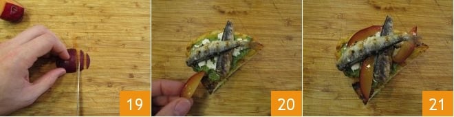 Para finalizar, decore as bruschettas com pesto de ervas e sardinhas grelhadas com fatias de ameixa 19, que você pode posicionar sobre as fatias de pão 20. Está pronto o seu aperitivo, bom apetite 21!