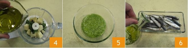 e finalmente o óleo 4. Acione as lâminas até obter um pesto cremoso, coloque-o em uma tigela e deixe um momento de lado 5. Passe para as sardinhas: se quiser limpá-las você mesmo, pode seguir nossos conselhos sobre Como limpar as anchovas. Coloque-as em um recipiente e regue com algumas colheres de óleo 6,