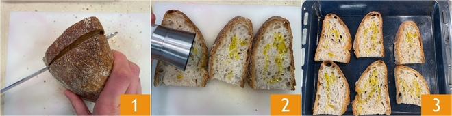 Para preparar as bruschettas com queijo e tomatinhos, como primeiro passo corte o pão em fatias 1. Tempere-as com 2 colheres de azeite, uma pitada de sal 2 e um pouco de pimenta; em seguida disponha-as em uma assadeira 3. Leve ao forno na função grill a 220 por 6-7 minutos, até ficarem bem douradas e crocantes.