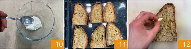 Enquanto isso, mexa a crescenza com uma colher para amolecê-la. Quando estiverem prontas, retire as bruschettas do forno 11 e esfregue-as imediatamente com o dente de alho para perfumá-las 12.