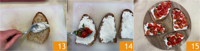 Distribua então a crescenza sobre o pão ainda quente, espalhando-a de maneira uniforme 13. Decore com os tomatinhos temperados, distribuindo-os em cada fatia 14, e finalize com o restante do azeite. Sirva as bruschettas com queijo e tomatinhos bem quentes imediatamente 15.