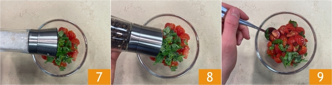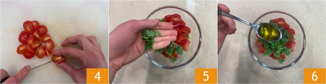 Enquanto isso, dedique-se aos tomatinhos: lave-os, seque-os e corte-os em quatro 4. Coloque-os em uma tigela e tempere com o manjericão rasgado à mão 5 e duas colheres de azeite 6.