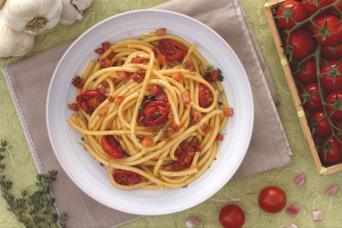 Os bucatini com tomatinhos confit e cubos de bacon defumado são um prato principal saboroso e delicioso para preparar em um jantar informal com amigos! Normalmente utilizados em pratos elaborados e da tradição romana, como os bucatini all'amatriciana ou para outros molhos robustos como o de salsicha, também com os tomatinhos confit e o bacon frito na panela, os bucatini ganham um sabor convidativo e apetitoso.