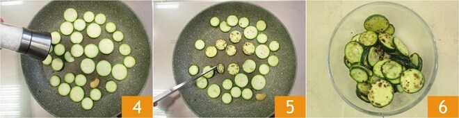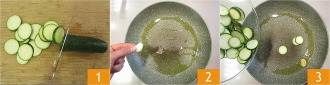 Para preparar os bucatini cremosos com abobrinha e hortelã, comece cortando as extremidades das abobrinhas e cortando-as em rodelas 1. Em uma panela, doure um dente de alho descascado com um fio de óleo 2, depois adicione as abobrinhas 3.