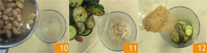 Uma vez amolecidas, despeje as castanhas-de-caju com sua água em um copo medidor 10, depois adicione quase todas as abobrinhas 11 e uma colher de levedura nutricional 12.
