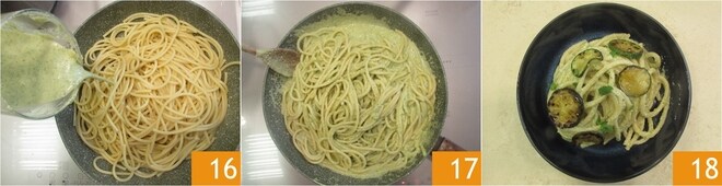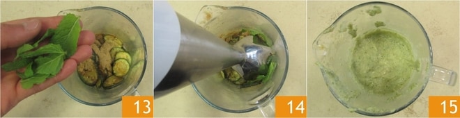 Adicione também algumas folhas de hortelã 13 e uma pitada de sal e bata com um mixer de imersão 14 até obter uma consistência cremosa e homogênea, diluindo se necessário com um pouco da água do cozimento da massa 15.