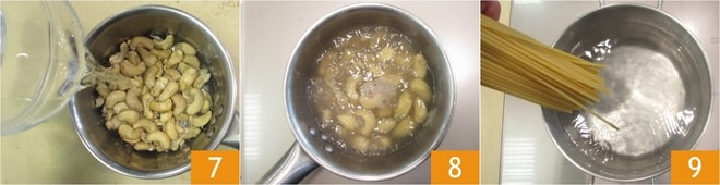 Enquanto isso, coloque as castanhas-de-caju em uma panela pequena e cubra com água 7, depois leve ao fogo e ferva por cerca de 5 minutos, apenas o tempo suficiente para amolecerem 8. Cozinhe também os bucatini em água fervente com sal 9.