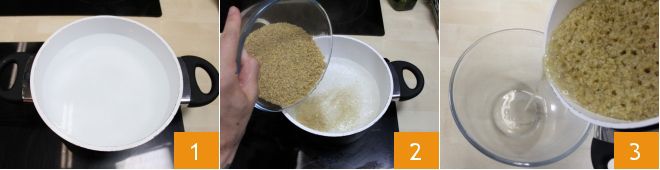 Para preparar o bulgur com pesto de ervas frescas e nozes, comece pela preparação do bulgur: lave o bulgur em água corrente, leve 600 ml de água para ferver 1, adicione sal e despeje o bulgur 2; cozinhe por cerca de 15-20 minutos (ou conforme indicado na embalagem), após esse tempo escorra-o, coloque-o em uma tigela 3