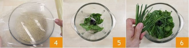 e cubra com filme plástico 4, reserve até que esteja morno. O bulgur terá dobrado de volume. Agora dedique-se ao pesto: pegue um mixer (se preferir, pode usar também um pilão) coloque dentro as ervas aromáticas previamente lavadas e secas: o manjericão 5, os talos de cebolinha 6,
