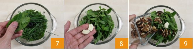 as folhinhas de hortelã 7, o dente de alho 8 (que você pode omitir se não gostar), as nozes descascadas 9