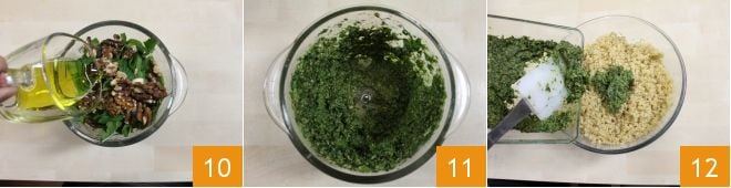 e adicione um fio de azeite 10, ligue o mixer e adicione aos poucos mais azeite de oliva quanto baste para obter uma mistura quase aveludada 11. Ajuste o sal e transfira o pesto para a tigela contendo o bulgur, misturando para que o bulgur absorva o sabor do pesto de ervas 12.