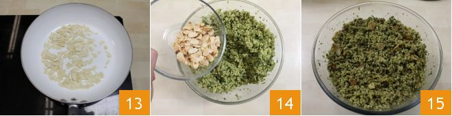 Agora, toste por alguns minutos as amêndoas em uma frigideira quente sem adicionar óleo 13, mexendo várias vezes para evitar que queimem. Adicione as amêndoas tostadas ao bulgur e misture para obter uma mistura homogênea. Seu bulgur com pesto de ervas frescas e nozes está pronto para ser saboreado!