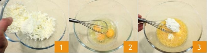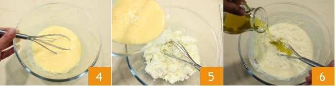 e misture com o batedor para incorporá-lo 4, adicione a mistura de ovos batidos ao skuta 5, misture a mistura, por último, adicione em fio o azeite de oliva 6 sempre mexendo.