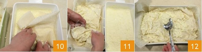 Pegue outra folha de massa filo, torça-a e mergulhe-a na tigela com a mistura de ovos e queijo para dar sabor 10 e depois estenda-a na assadeira 11. Continue assim, mergulhando as folhas de massa no recheio até acabar os ingredientes, tomando cuidado para terminar com uma camada de apenas recheio distribuído com uma colher na superfície 12.
