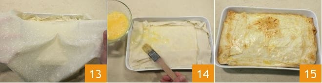 Feche com uma folha de massa filo seca a ser estendida sobre a superfície 13, dobre as bordas para dentro para fechar a massa de modo que o recheio não saia e pincele toda a superfície com o ovo batido 14. Asse o burek de queijo em forno estático a 180° por 50 minutos (se forno ventilado a 160° por 40 minutos). Quando estiver pronto, seu burek ficará dourado na superfície, retire do forno 15 e deixe esfriar um pouco antes de servir.