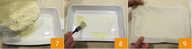 Transfira a mistura obtida para uma tigela grande 7, depois unte uma assadeira retangular de cerca de 30x20 cm 8, forre o fundo com uma folha de massa filo, deixando a massa cair sobre toda a borda porque servirá para fechar a massa 9.