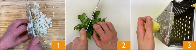 Para preparar os burgers de espinafre, primeiro descasque e pique finamente a cebola 1. Depois, lave os espinafres, escorra-os e pique-os grosseiramente também 2. Descasque as batatas e rale-as cruas 3.