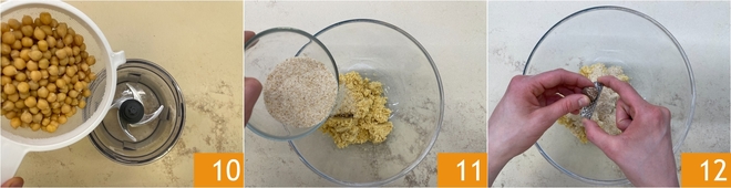Enquanto isso, bata o grão-de-bico já cozido 10 até obter um creme grosso. Transfira o purê de grão-de-bico para uma tigela grande e adicione farinha de rosca 11 e noz-moscada 12.