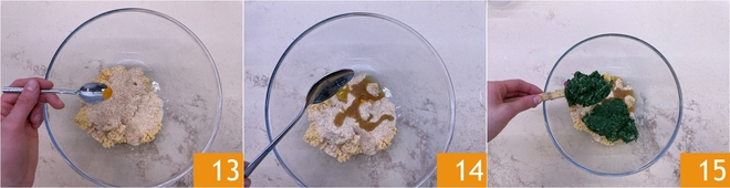 Adicione também a cúrcuma 13 e 2 colheres de sopa de azeite 14. Depois, adicione a mistura de espinafre e batata 15.