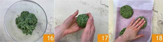 Amasse com as mãos até obter uma mistura macia e modelável 16. Forme 4 burgers de aproximadamente 160-170 g 17 e coloque-os em uma bandeja forrada com papel manteiga. Achate-os levemente com as mãos 18.