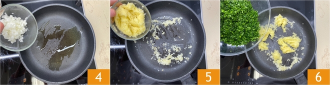 Em uma panela, coloque duas colheres de sopa de azeite, adicione a cebola picada 4 e deixe-a murchar em fogo baixo por cerca de 5 minutos. Em seguida, adicione as batatas 5 e os espinafres 6.