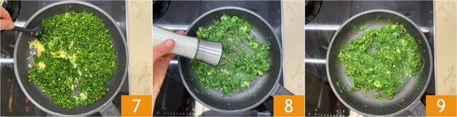 Cozinhe por cerca de 5-6 minutos em fogo médio, mexendo de vez em quando 7 e ajustando o sal e a pimenta 8. Quando a mistura estiver macia e seca, desligue o fogo 9 e deixe esfriar um pouco.