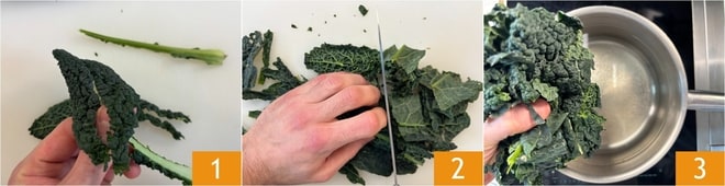 Para preparar os burgers de couve e grão-de-bico, primeiro limpe a couve separando os talos das folhas 1, depois corte as folhas grosseiramente 2. Despeje a couve em uma panela com água fervente salgada 3.