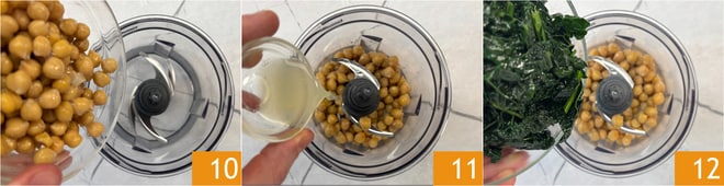 Em um processador, coloque o grão-de-bico escorrido 10 e o suco de limão 11, depois adicione a couve 12.