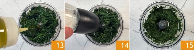 Adicione o azeite 13 e o sal 14, depois processe até obter uma consistência bastante grosseira, não perfeitamente lisa 15.