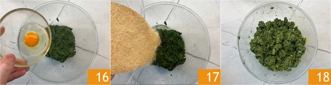 Transfira a mistura para uma tigela, depois adicione o ovo 16 e a farinha de rosca, gradualmente 17. Misture com um garfo para integrar bem, ajustando a quantidade de farinha de rosca conforme a consistência 18.