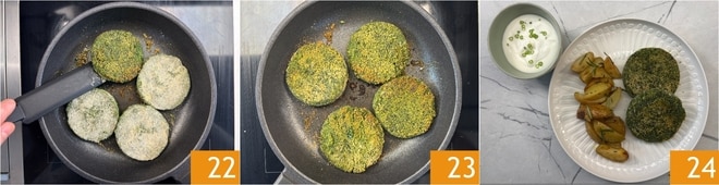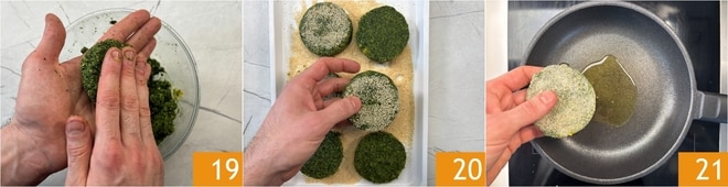 Forme os burgers compactando e achatando um pouco da mistura na palma da mão 19; para obter uma forma mais precisa, você pode usar um copo ou um aro de corte. Com estas quantidades, você obterá 6 burgers com cerca de 9 cm de diâmetro. Coloque-os em uma bandeja forrada com papel manteiga onde você tenha polvilhado mais um pouco de farinha de rosca e cubra levemente ambos os lados 20. Você está pronto para cozinhar: coloque os burgers em uma frigideira antiaderente onde você tenha aquecido um fio de azeite 21.
