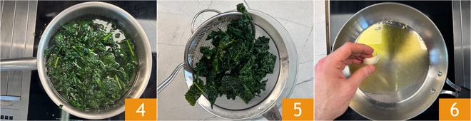 Cozinhe a couve por cerca de dez minutos 4, depois escorra para eliminar o excesso de água 5. Em uma frigideira, doure um dente de alho em um fio de azeite 6.