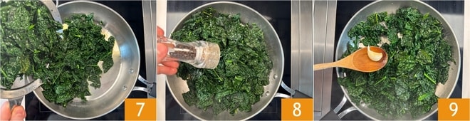 Adicione a couve bem escorrida 7, sal, pimenta 8 e refogue por cerca de 10 minutos em fogo médio. Desligue o fogo, remova o alho 9 e deixe esfriar um pouco.