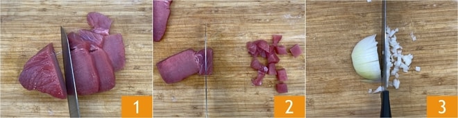 Para preparar as busiate ao ragu de atum, corte o atum fresco primeiro em fatias de 1,5-2 cm de espessura 1 e depois em cubos 2. Limpe e pique finamente a cebola 3.