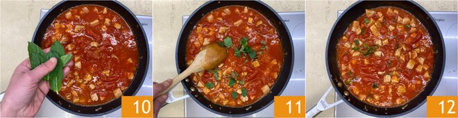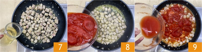 Neste ponto, aumente o fogo e flambe com o vinho branco 7. Uma vez evaporado, despeje os tomates pelados 8 e amasse-os com a colher, depois adicione um pouco de água, apenas o suficiente para enxaguar a tigela 9. Adicione também o extrato de tomate.