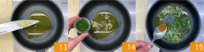 Enquanto isso, prepare a farofa: em outra frigideira, aqueça o óleo com o alho 13 e a salsinha 14, finamente picados. Adicione também a pimenta 15.