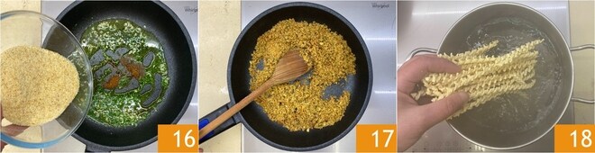 Despeje a farinha de rosca 16 e deixe dourar em fogo moderado, mexendo sempre 17. Reserve a farofa e coloque no fogo uma panela com água para ferver e salgar. Quando o molho estiver pronto, mergulhe a massa na água fervente salgada 18.