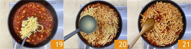 Escorra as busiate ainda bem al dente e transfira para a frigideira com o molho 19. Termine de cozinhar a massa ajudando-se com uma concha da água do cozimento 20, mexendo bem para combinar tudo 21.