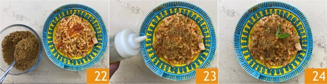 Sirva e decore com bastante farofa 22, depois finalize o prato com um fio de azeite cru 23 e algumas folhinhas de hortelã fresca: suas busiate ao ragu de atum estão prontas para serem servidas 24!